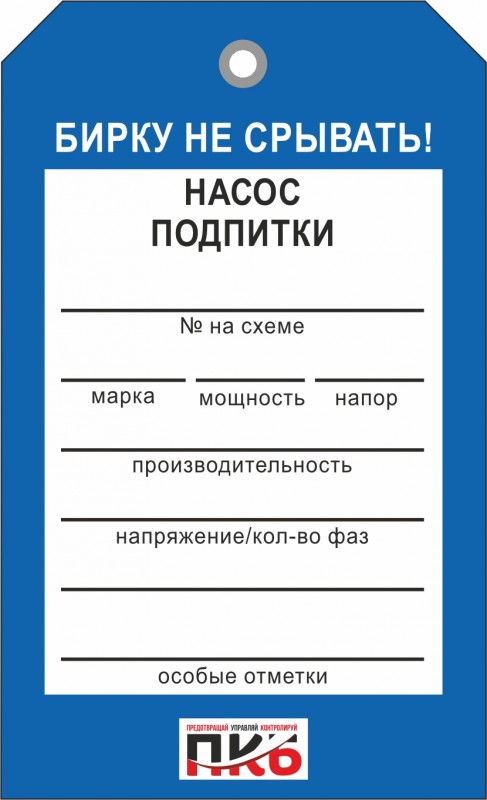 Информационная бирка "Насос подпитки". Изготовлена из пластика ПВХ, толщиной 0,3 мм, без ламинации, диаметр отверстия 7 мм. По желанию заказчика толщина бирки может быть увеличена до 1-2 мм. Нанесение текста необходимо производить маркером или шариковой ручкой. Размер 70 х 115 х 0,3 мм.