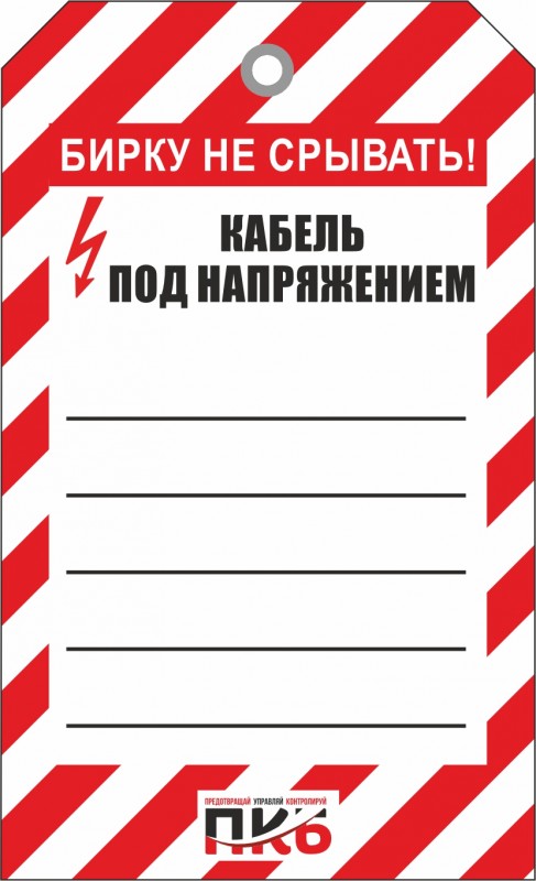 Информационная бирка "Кабель под напряжением", арт. PKBS93, односторонняя. Изготовлена из пластика, без ламинации, толщиной 0,3 мм, без люверса, Ø отверстия 7 мм. По желании заказчика толщина бирки может быть увеличена до 1-2 мм. Нанесение текста можно производить маркером или ручкой. Размер 70 х 115 х 0,3мм.